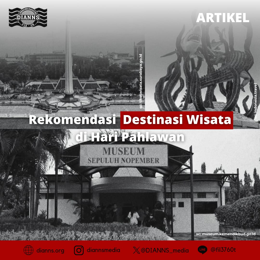 Pada tahun ini, Bangsa Indonesia akan memperingati hari pahlawan untuk yang ke-65 kalinya terhitung sejak keputusan presiden tersebut dikeluarkan. Tentunya, ragam sekali cara yang bisa dilakukan untuk memperingati peristiwa tersebut. Beberapa diantaranya adalah dengan melakukan upacara bendera, menggelar doa bersama, dan masih banyak lainnya. Tapi, bagaimana jadinya kalau hari pahlawan diperingati dengan berjalan-jalan di Kota Surabaya? Ya, Kota yang dikenal dengan julukan Kota Pahlawan tersebut nyatanya menyajikan banyak destinasi wisata, tak terkecuali destinasi wisata edukasi yang menyangkut perjalanan bangsa Indonesia. Salah satu destinasi wisata edukasi sejarah yang bisa kamu kunjungi di Kota Surabaya dalam rangka memperingati hari pahlawan adalah Monumen Tugu Pahlawan dan Museum Sepuluh Nopember.